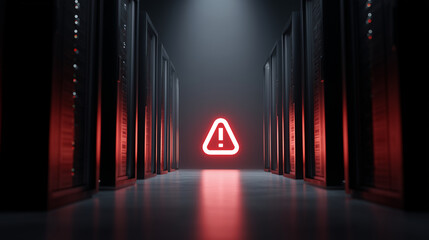 server outage, offline servers, warning symbol, dark data center, glowing red lights, cyber illustration, high detail, modern flat design, minimalistic, digital art