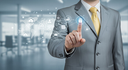 ** Cybersecurity Protection: Businessman Securing Global Network with Data Privacy & Cloud Computing Technology in Modern Office