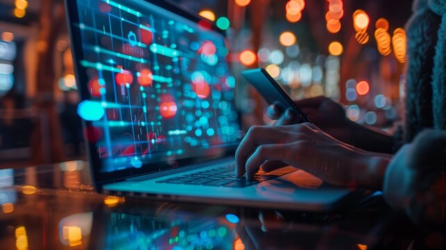 Close-up of hands typing on a laptop with a cybersecurity interface displayed on the screen, surrounded by colorful lights.