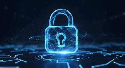 Futuristic glowing lock icon on dark background emphasizing cybersecurity theme