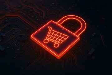 Neon orange padlock with circuit patterns over a glowing blue and orange tech background. Symbolizing cybersecurity, technology, and protection. Ai generative