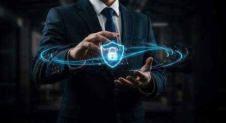 Businessman displays a digital shield with lock graphic.