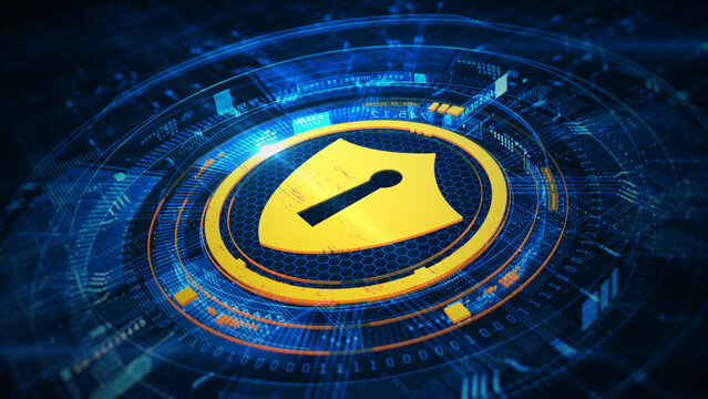 Cybersecurity shield icon with a keyhole, displayed on a blue hexagonal grid. Ideal for illustrating data protection, encryption, and secure digital networks. Technology background. 3D Rendering