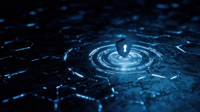 Cybersecurity Shield on Hexagonal Grid: Data Protection, Network Security, and Digital Defense Concept
