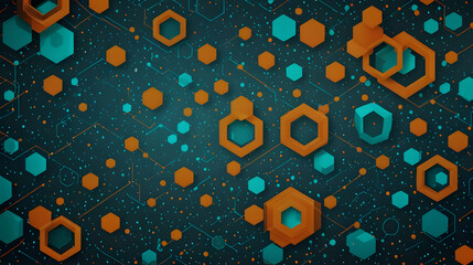 Dynamic tech network with glowing orange and teal hexagons and connected data points