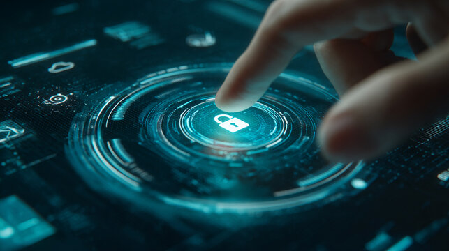 Finger activates a glowing cyan digital lock icon on a futuristic interface, symbolizing online security and data protection, ideal for technology or cybersecurity concepts