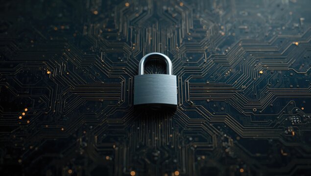 Digital security icon with a lock on a motherboard, highlighting cybersecurity practices