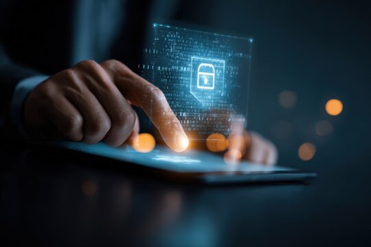 A hand touching a digital interface with a padlock icon representing cybersecurity and data protection