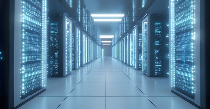 Futuristic data center with high-tech servers and digital interface