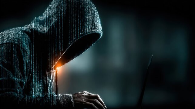 Person in hoodie using a computer with cybersecurity and hacking interface on screen in darkened room for digital security concept
