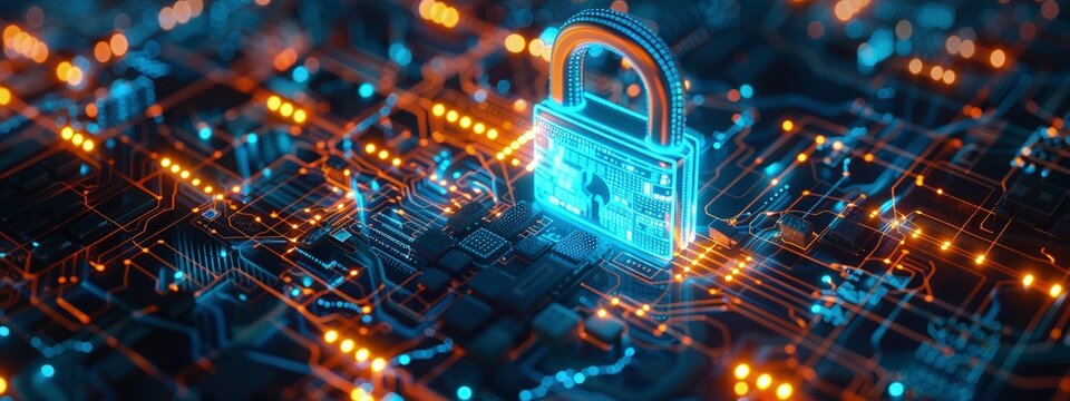 cyber security concept closeup motherboard with digital padlock. Secure connection theme or background for safety lock online security. cybersecurity web banner design.