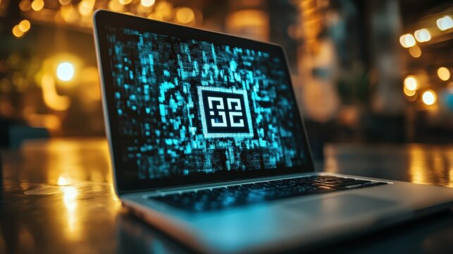 Binary code encryption concept with glowing dots, pixelated data stream on digital interface.
