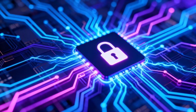 Cyber security concept depicts a digital padlock composed of intricate circuit board patterns, placed on top of a glowing circuit board, symbolizing data protection and network safety with a gradient