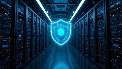 Secure IT data center corridor with glowing cybersecurity shield on server cabinets, perfect for cloud security concepts, enterprise data protection, and modern digital infrastructure