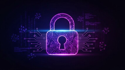 Glowing neon padlock cybersecurity concept in digital network