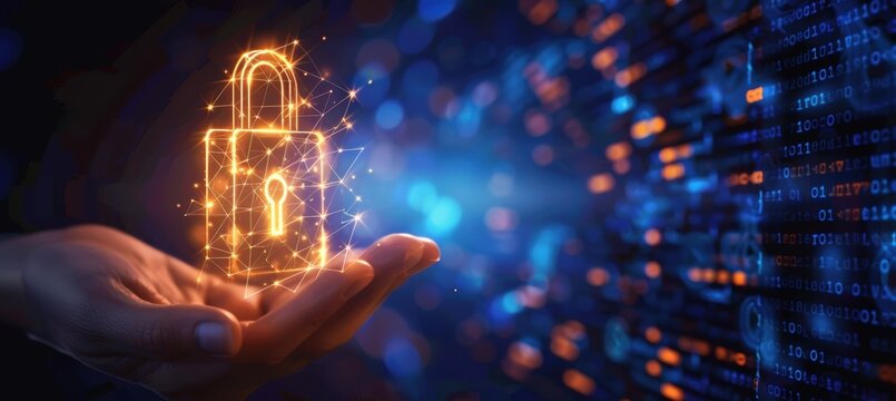 Digital security concept with glowing padlock in hand, symbolizing protection and safety in technology. background features abstract data patterns, enhancing theme of cybersecurity