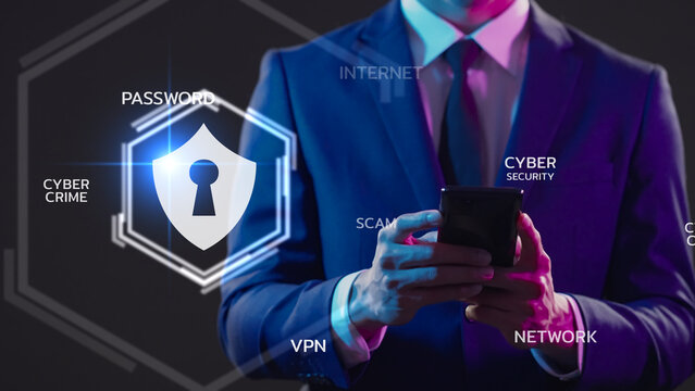 Man typing on mobile phone internet security and data protection concept, hardware wallet blockchain and cybersecurity