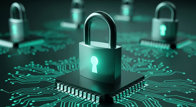Padlock on circuit board, glowing keyhole, symbolizes digital security, data protection, and cybersecurity, representing online safety and network protection