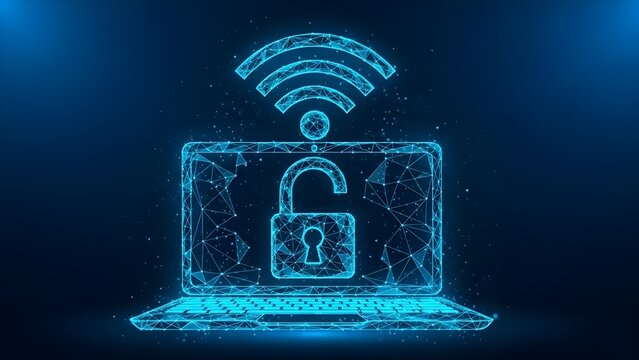 Digital concept of an unlocked padlock superimposed over a glowing blue polygonal laptop screen symbolizing secure wireless network access and data protection technology in cyberspace.