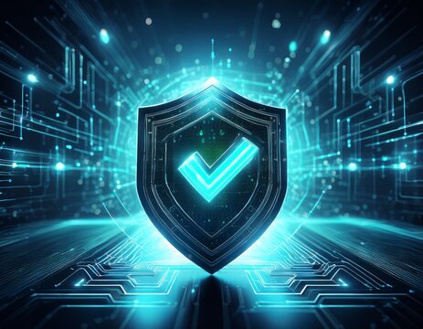 illuminated shield with a checkmark symbolizing cybersecurity concept of secured digital space