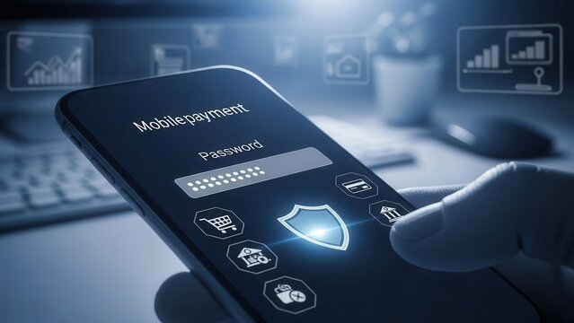 Secure mobile payment authentication with password protection and digital shield icon on smartphone. Online banking and e-commerce safety technology concept for cybersecurity and finance