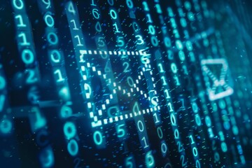 A glowing red email envelope icon superimposed on a background of red and blue binary code, symbolizing digital communication and cybersecurity.