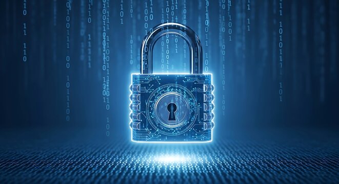 Digital padlock over binary code background, glowing blue tones, sharp focus, cybersecurity concept.