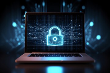 A laptop displaying a glowing padlock icon representing cybersecurity. Digital security concept with futuristic blue icons and dark background.