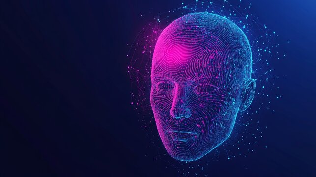Futuristic 3D rendered digital human head outline with neon fingerprint-like contour lines against a deep blue background. Concept of digital identity, biometrics, cybersecurity, advanced technology