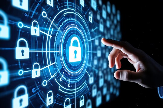 Human finger interacting with a futuristic digital interface displaying glowing padlocks