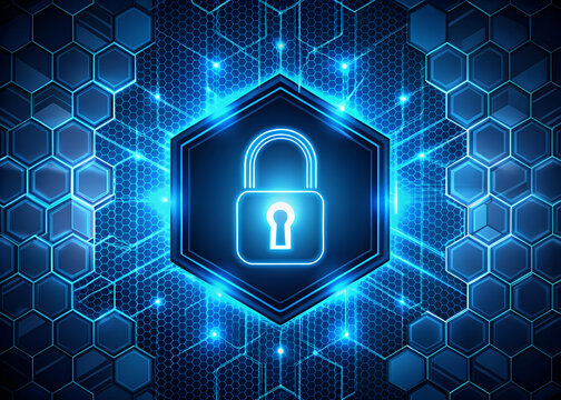 Glowing padlock icon in hexagon frame over blue digital network, cybersecurity concept