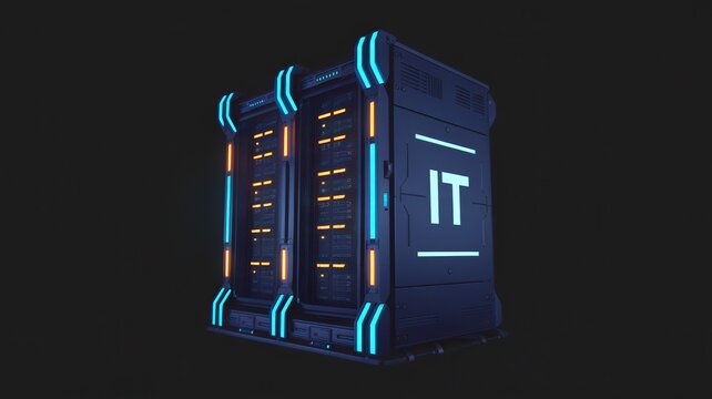 Server room with IT lettering and neon lights. Data center concept.