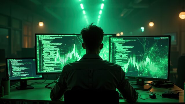 Cyber Analyst Monitoring Data and Graphs on Multiple Screens in High-Tech Office
