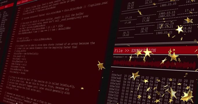 Displaying red encryption progress bar with waveform in terminal windows overlaying golden stars