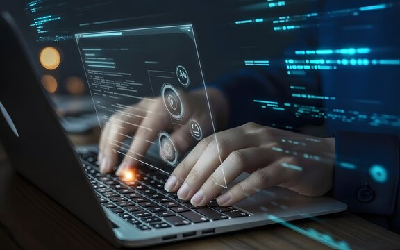 Programmer coding innovative technology solutions amidst glowing digital interfaces and data streams.