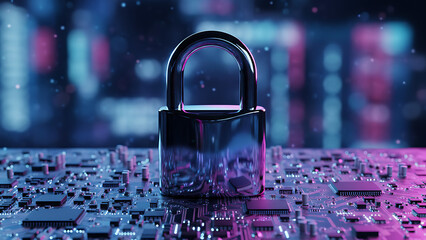 Digital cybersecurity concept with glowing lock and circuitry