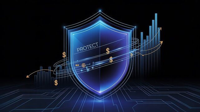 Golden bitcoin shield protecting crypto wealth while scattering us dollars and coins