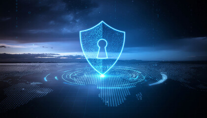 Cybersecurity shield protecting global data network with digital keyhole, offering modern data privacy solutions and security against cyber threats now