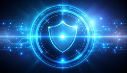 Glowing neon-blue shield in cybersecurity concept