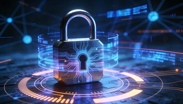 Futuristic digital security concept with padlock and fingerprints