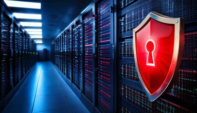 Red glowing shield with keyhole symbol on server rack in data center with rows of servers an.jpg