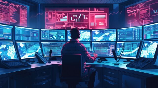 A person in a dark server room, focused on multiple computer screens displaying complex data.