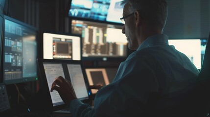 A focused man analyzes complex data on multiple digital screens, surrounded by a dark office setting illuminated by blue light, reflecting his concentration and expertise in technology