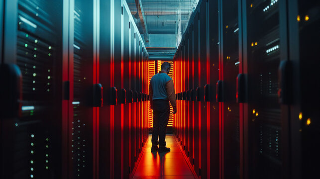 Modern IT Expert Analyzing Data in High-Tech Server Room: Dedicated Professional Monitoring Digital Infrastructure - Illuminated Servers Reflecting Cutting-Edge Technology and Network Solutions