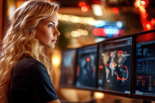 Focused professional monitors data streams at a control center. Surrounded by screens displaying maps and code, the person seems engaged in critical surveillance and response.