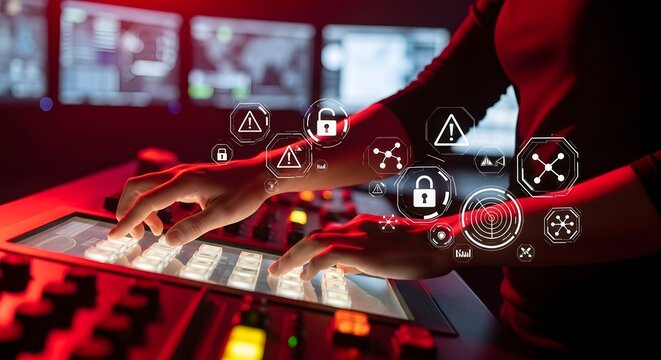 Cybersecurity expert working on a digital interface in a futuristic control room, managing data protection and network security systems
