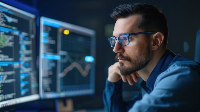 Close-up of a focused male software developer with glasses analyzing code and data on dual computer monitors in a dark workspace.