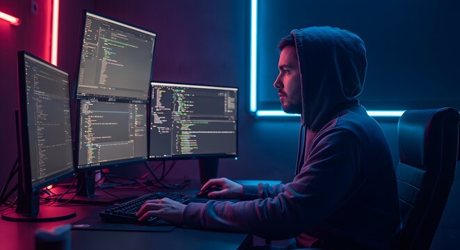 Focused software developer coding on multiple computer screens, immersed in technology, cybersecurity, data analysis, and innovative digital solutions.
