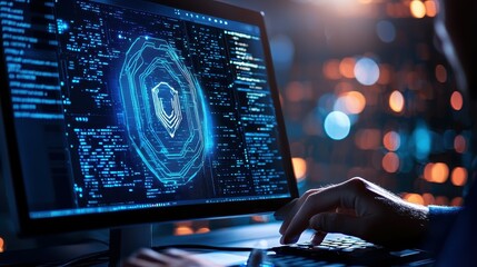 Close-up of a cybersecurity expert coding at a computer with data visualization on screen.