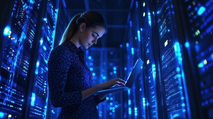 Focused IT professional using a laptop while standing in a server room with racks of network equipment illuminated by blue lights